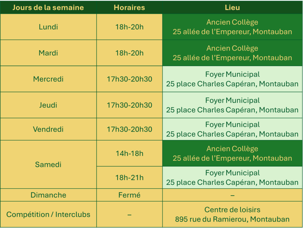 Ouvert tous les soirs du lundi au vendredi à l’Ancien Collège de Montauban et le samedi après-midi pour les cours, venez nous rejoindre pour :