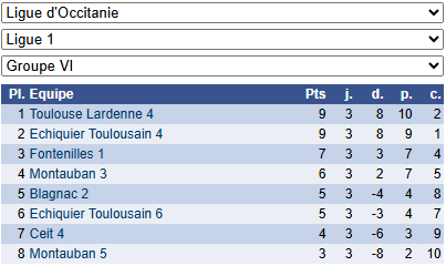 Notre équipe 5, composée de 4 joueurs, évolue en division régionale Ligue 1 Occitanie, dans le groupe VI.