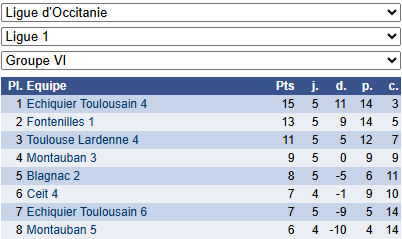 Notre équipe 5, composée de 4 joueurs, évolue en division régionale Ligue 1 Occitanie, dans le groupe VI.
