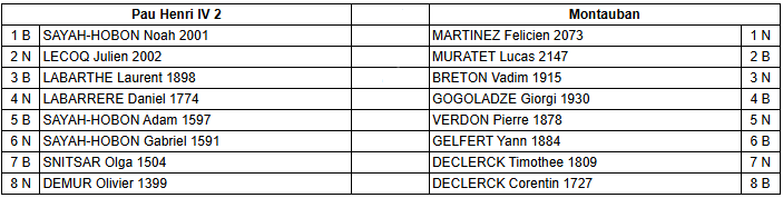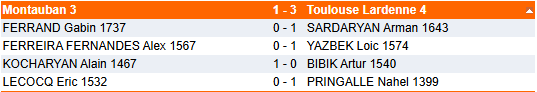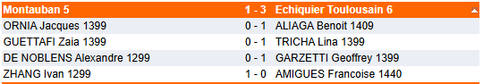 Même constat aux échiquiers 5 et 6 où les noirs l’emportent à chaque fois. Bon résultat donc pour Alain, et tout n’est pas fini pour Franck qui continue à jouer son rôle de capitaine. Au deuxième, Bruno craque contre un adversaire redoutable que Montauban affronte tellement souvent. Mais tout reste toujours à l’équilibre dans ce match, puisqu’à côté, Frédéric continue son sans faute en N4 et de quelle manière !