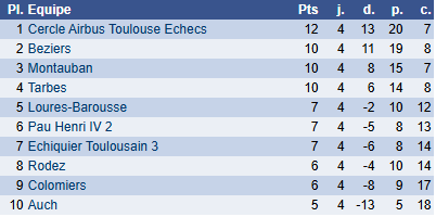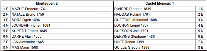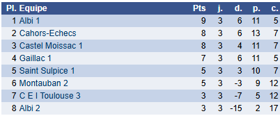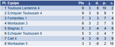 L’équipe de l’ouest tarn-et-garonnais prend donc sa revanche après les brillantes qualifications de nos 2 équipes de Loubatière le dimanche précédent. Cette équipe n’a toujours pas perdu en N4 cette saison. Sur ce classement, on peut y voir les conséquences directes avec notre équipe Montauban 2 qui va y jouer le maintien, tandis que Castel est au chaud.