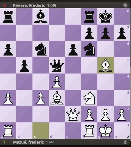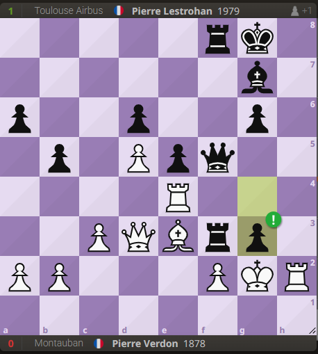 Dans la position ci-dessus, Fred fait lentement imploser son fort adversaire avec le fameux adage « un coup, une menace ». Après l’erreur Ce8 voulant garder la structure intacte, notre joueur trouve le seul coup Fe4 qui gagne en ligne (gain forcé d’une qualité) !