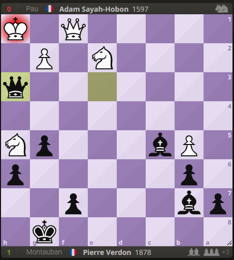 Vadim subit sa partie mais a le mérite de se battre le plus longtemps possible pour ses coéquipiers. Il finit par s’incliner en finale de pions, Corentin également, mais ces deux points auront été durs à aller chercher pour les béarnais. Il nous reste donc deux joueurs en finale, et c’est Giorgi, en grand prince qui se sacrifie pour l’équipe, oublie volontairement sa possibilité de victoire et une poignée de points elo, pour assurer une troisième victoire collective cette saison !