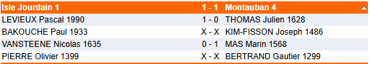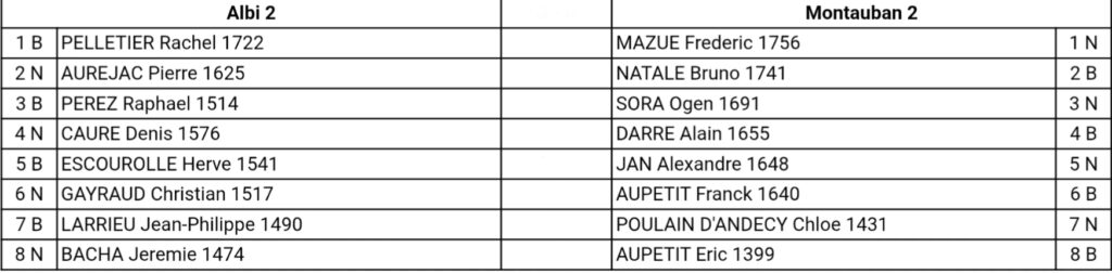 Montauban 3, l’ambitieuse, avait fort à faire contre une grosse équipe de l’ET 4. Une nouvelle défaite les enlise dans le ventre mou du classement. Mais cette très jeune équipe commence à obtenir ce qu’elle cherche en se frottant au gratin régional. Et aura encore 3 autres occasions de battre une équipe d’un autre club. Bravo à Alain pour sa nouvelle victoire, qui en annonce d’autres très prochainement en N3 jeunes.