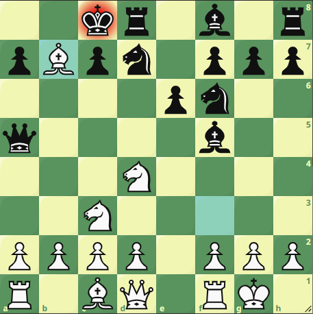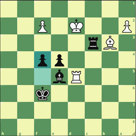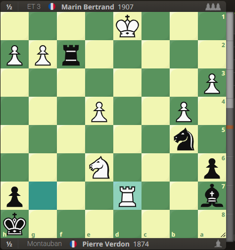 D’autant plus qu’à côté, Vadim maîtrise aussi bien sa partie. Il a la bonne pièce mineure dans une finale de tours où le jeu est très ouvert. Il conclut grâce à l’autoroute déroulée pour son pion a. Ce qui porte le score à 2-0. Décidément, les échiquiers du haut terminent plus tôt que ceux du bas dans ce match. Au 2, après une partie d’abord calme puis d’un coup très explosive, je m’en tiens au plan d’équipe en contrôlant tout mouvement. Très pleutre, je ne laisse pas d’autre choix à mon adversaire que de me suivre dans cette nulle forcée… Pouvez-vous la trouver ?