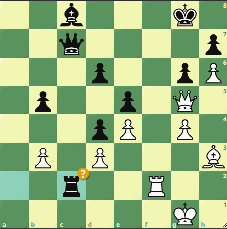 Restons en haut au rayon des bonnes nouvelles. Notre président retrouvait l’échiquier 1 auquel il a le plus joué dans sa vie. Après une partie équilibrée, marquée par un h3-h4 bien timé, l’adversaire croit même prendre le dessus avec le coup le plus normal du monde Txc2 qui gagne un pion. Mais Félicien a tout vu. Pouvez-vous trouver le dernier coup de la partie qui fera abandonner l’adversaire ?