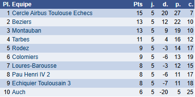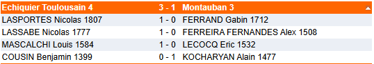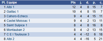Montauban 4, la baroudeuse, jouait aussi contre un prétendant à la première place de son groupe. Et avec cette nouvelle composition d’équipe, elle réalise un énorme exploit en tenant en échec son hôte de L’isle Jourdain. L’inversion audacieuse est récompensée, bravo à Marin pour la victoire, aux nulles importantes de Joseph et Gautier, et au sacrifice de Julien dans une compo très intelligente. L’équipe peut viser le milieu du classement et devrait bientôt connaître la victoire.