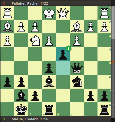 Et justement, sur un autre échiquier où nous avons les blancs, Giorgi comme à son habitude ne laisse pas respirer son adversaire. Récent vainqueur de deux tournois de blitz internes très relevés, il est surentraîné et tranchant comme jamais. Et quand la faute arrive, il nous gratifie de cette attaque flamboyante :