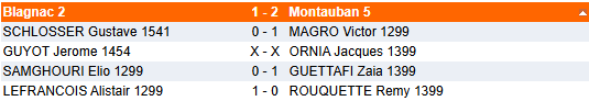 Montauban 5, la mascotte, se rendait elle à Blagnac pour trouver la faille. Et c’est mission réussie ! Victor gagne son tout premier match en équipe, et un grand BRAVO à Zaia qui porte cette équipe en gagnant sa partie. Le capitaine Jacques fait la nulle qu’il faut pour assurer la victoire, et l’équipe 5 décolle !