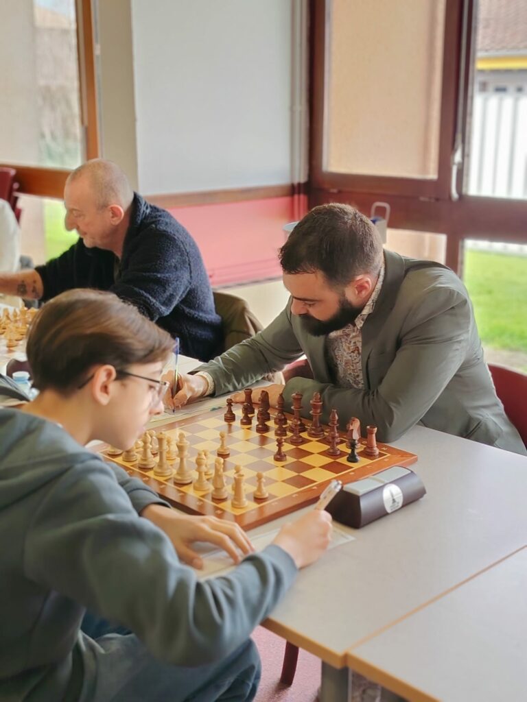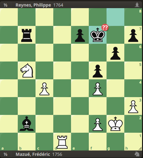 La défaite d’Alexandre et 3 nulles suivent. On mentionnera celle de Florian, Pierre restant solide comme un roc face à son homonyme, et Fred, dans son rôle de capitaine d’un jour, malheureux après une mauvaise nuit qui l’a fait rater une tactique facile :