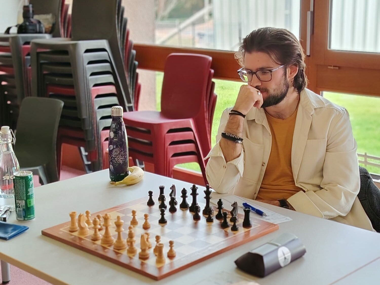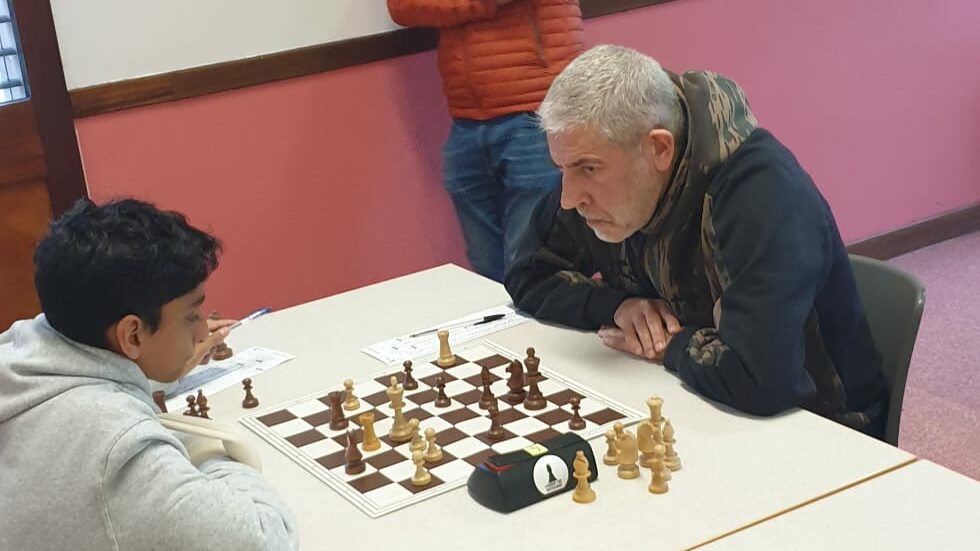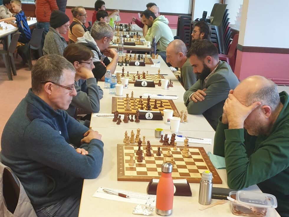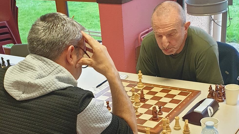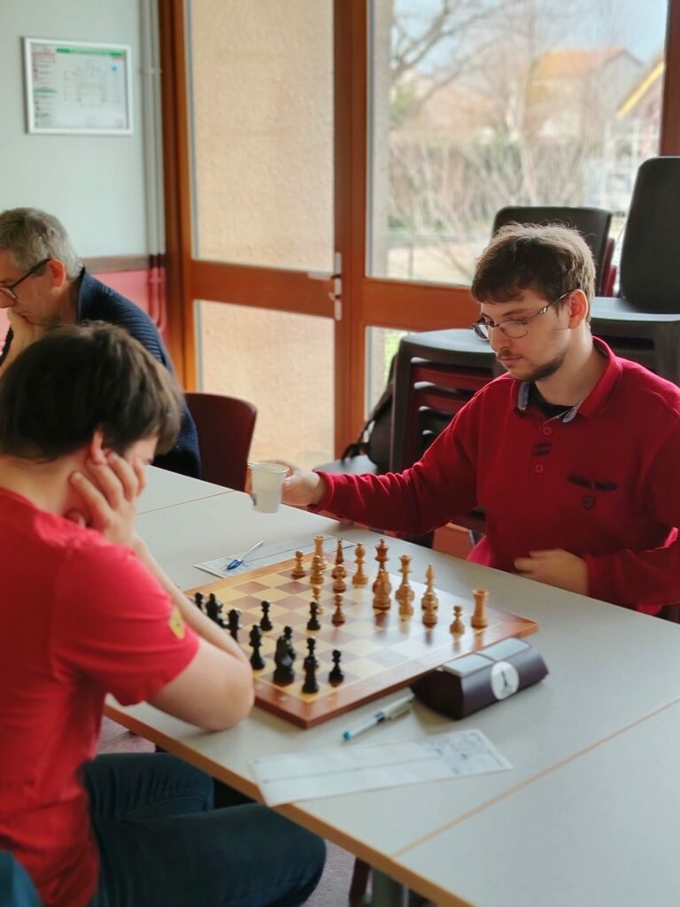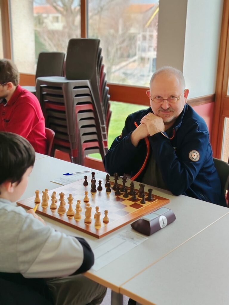Pour son anniversaire, Eric A (ci-dessus) doit se contenter d’une nulle avec les noirs. L’équipe reste 4ème de sa poule mais est aussi proche du podium que de la dernière place.