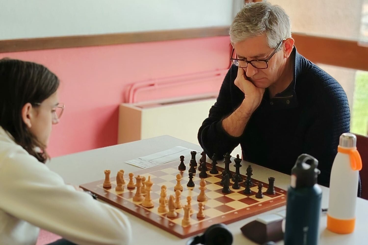 Le score reste un certain temps à ce très étriqué 1-1. Bruno, Ogen et Alain restent concentrés. Qui fera la décision ? Finalement les pièces noires l’emportent sur tous les échiquiers du bas, grâce à Alain et au grand dam d’Ogen, qui nous gratifie tout de même de photos de haute qualité.