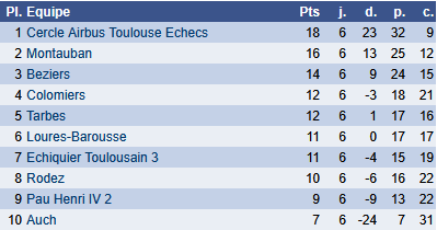 L’équipe 1 se déplace à Auch pour y affronter la lanterne rouge de ce championnat. Une dégringolade spectaculaire pour cette équipe qui avait échoué deux fois de suite d’un point à son objectif de montée en N2, lors des deux saisons précédentes. Systématiquement avec une équipe très solide, l’échiquier de l’Armagnac avait autant de fois défait celui de la cité d’Ingres alors. Cette fois-ci, nous avons l’avantage : il est donc temps de leur rendre la pareille !