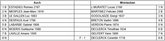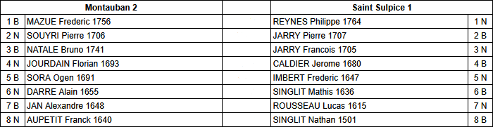 L’équipe 2 veut maintenant enchaîner ! Après une victoire arrachée au courage à Albi, elle peut se mesurer à une équipe sensiblement du même niveau sur le papier : L’échiquier de la Pointe. Un choc de milieu de tableau indécis comme on peut le voir sur la feuille de match :