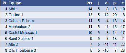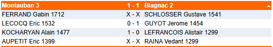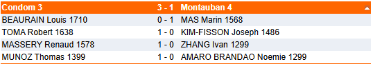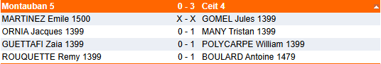 L’équipe 3 effectue une nouvelle contre-performance contre une équipe précédemment battue par Montauban 5. Bravo cependant à Alain qui est le seul à gagner, et ce pour la troisième fois de suite !