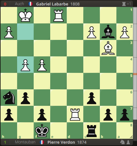 Le match est bien lancé, avec des ouvertures parfois surprenantes sur certains échiquiers. A la salle du boulodrome d’Auch, si Timothée aura eu deux fois un match facile cette saison, je me frotte une deuxième fois à l’adversité la plus jeune possible du club adverse. Mais cette fois-ci, c’est une leçon d’échecs, une correction sans précédent qui m’attend. En effet, dominé dans tous les secteurs du jeu, ma position devient vite désastreuse :