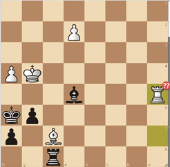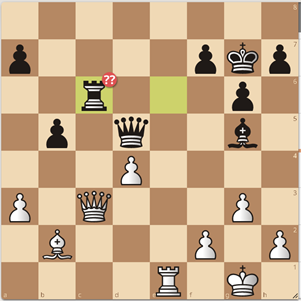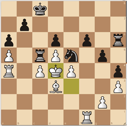 La position est très dure pour Lucas. Si les noirs jouent 35. … F×d5+, ils protègent f7, ont 2 pions de plus et un roi à l’abri. Les blancs restent avec 2 pions faibles b3 et d3 et un roi dans les courants d’air. Mais son adversaire se trompe et joue :