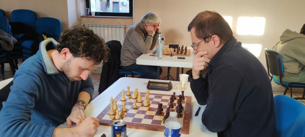 Le club voisin, et ami s’invite pour la première fois du tournoi à la table 1 grâce à Joël (à droite au premier plan sur la photo). Après beaucoup de rebondissements, la partie tournera en ma faveur. Cela officialise quasiment que le titre restera à Montauban ! En effet, après les appariements de la ronde 5, on peut constater que seuls 4 joueurs sont encore en position réaliste de jouer le titre : Vadim et Yann qui n’avaient pas dit leur dernier mot, et les deux Pierre. En somme, les 4 plus hauts elo. Les autres joueurs comptent sur les deux dernières parties pour terminer le plus haut possible.
