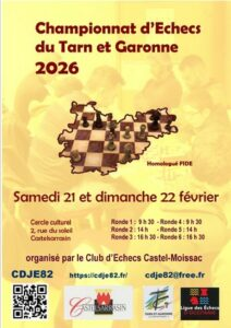 La salle Marcelle Duba, attenante à la médiathèque de Castelsarrasin accueillait en ce weekend des 21 et 22 février le championnat du Tarn-et-Garonne 2026. Un classique très exigeant (6 rondes en 60’+30 »), qui n’en reste pas moins le trésor le plus précieux du CDJE 82 : avec son inscription gratuite et réservée aux licenciés tarn-et-garonnais, n’oublions pas que c’est une compétition qui n’a pas son équivalent dans bon nombre d’autres départements !