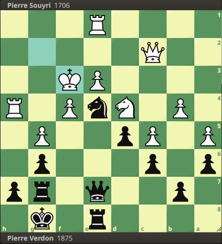 Et les surprises démarrent très tôt le samedi, puisque grands favoris au elo, Vadim et Yann doivent s’incliner avec les Blancs respectivement aux rondes 1 et 2, contre de très bons joueurs venus de … Montauban ! Les heureux gagnants s’appellent Marin Mas et Pierre Souyri. Cela rebat les cartes. Yann et Vadim finiront tout de même la journée avec 2/3, tandis que Marin et Pierre.S s’affirment comme candidats potentiels au titre. A la faveur de ces évènements, de la troisième ronde de la journée, et de la nulle signée à la table 2, je suis seul en tête à 3/3 à mi-parcours, comme un an auparavant lors de l’édition précédente… ce qui ne présage pas toujours de la suite !