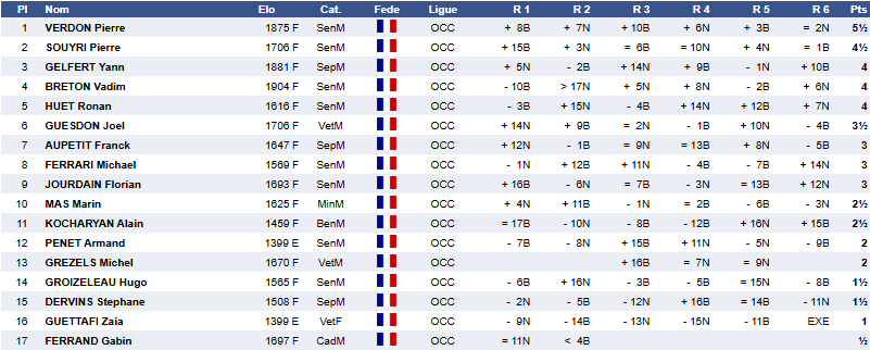 Mentionnons donc les grosses performances de Pierre.S, qui a failli tout rafler à la fin, avec un joli score de 2.5 contre les trois joueurs de N3. Une perf estimée à 1943 ! Le joli départ de Marin l’a amené à rencontrer tous les meilleurs, il finit en effet avec la plus haute moyenne elo adverse de tout le tournoi ! Premier jeune également. Pour le premier tournoi d’Armand, 2 victoires contre des joueurs classés sont très positives, et il sera sûrement classé lui aussi le 1er mars. Enfin, Zaia seule féminine termine devant l’intégralité des habitantes du Tarn-et-Garonne qui ne sont pas venues.